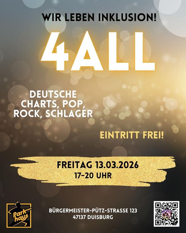 Nach dem großartigen Start in 2025 geht unser inklusives Partyformat 4ALL in die nächste Runde! Am Freitag, den 13. März 2026, verwandelt sich das Parkhaus auf der Bürgermeister-Pütz-Str. 123 in Meiderich ab 17 Uhr wieder in eine bunte Tanzfläche für alle, die gemeinsam feiern wollen. Bei 4ALL zählt nur eins: Gemeinschaft, Lebensfreude und gute Musik! Freut euch auf einen Abend voller Charts, Pop, Rock und Schlager – alles auf Deutsch und mit richtig guter Stimmung.