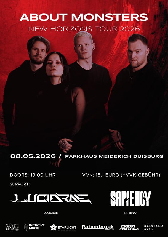 2026 wird das Jahr, in dem ABOUT MONSTERS neue Horizonte erobern und am 08.05.2026 ab 19 Uhr im Parkhaus Meiderich. Die „New Horizon Tour“ der Modern-Metal-Überflieger markiert einen Meilenstein in der Geschichte dieser jungen, aber bereits etablierten Band. Mit ihrer neuen Frontfrau Bianca Herrmann setzen sie frische musikalische Akzente, und auch ihr bisher veröffentlichtes Material erstrahlt in neuem Glanz.