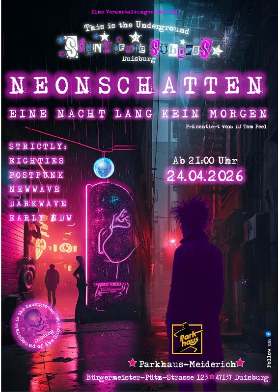 Nach einer erfolgreichen Premiere geht NEONSCHATTEN am 24. April 2026 in die zweite Runde – erneut im legendären Parkhaus Meiderich. SOUND OF THE SUBURBS lädt ein zu einer weiteren Nacht zwischen Neonlicht und Dunkelheit, zwischen treibenden Beats und melancholischen Hymnen.