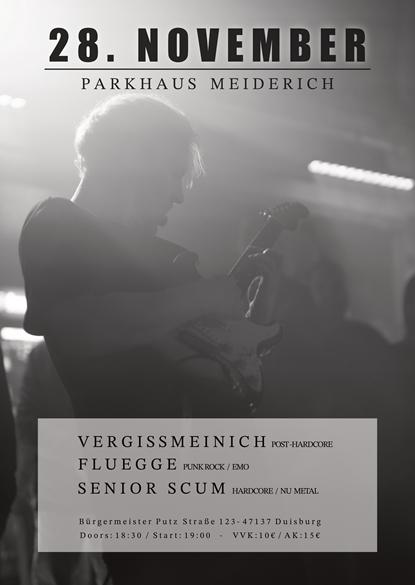 Am 28.11.2025 rocken die Bands VERGISSMEINICH, Fluegge und Senior Scum ab 19 Uhr (Einlass 18.30 Uhr) das Parkhaus Meiderich auf der Bürgermeister-Pütz-Str. 123.